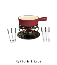 Traditional style cast iron cheese fondue set includes black pot, black wrought iron rechaud, six cheese fondue forks and fondue burner. Pot is enamelled inside and provides even heat distribution. Can be used on all heat sources - easy to clean. Capacity 2L/2 Qt. Gift boxed.